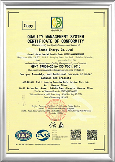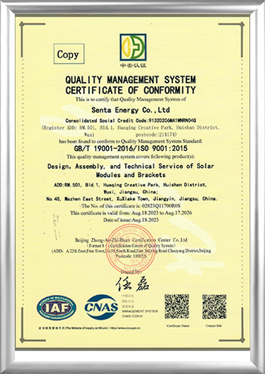 A 2016-ban alapított Senta Energy Co., Ltd., amelynek székhelye Wuxiban, Jiangsu államban található, egy high-tech vállalkozás, amely főként új energiájú fotovoltaikus energiatermeléssel és energiatárolással, új építésű előregyártott házakkal és új mezőgazdasági elosztott ültetvényekkel foglalkozik. Napelemes alkatrészek gyártói és Napelemes alkatrészek beszállítói. A független kutatás-fejlesztés, gyártás, értékesítés és szolgáltatás integrálásával elkötelezettek vagyunk amellett, hogy átfogó megoldásokat nyújtsunk a globális felhasználóknak az intelligens energia, az intelligens épületek és az intelligens ültetés teljes életciklusára vonatkozóan.